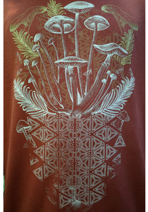 Created in collaboration with Chelsea Leigh, Mycelial Bloom represents the abundance of harvest season. After rain, sunshine draws out blooms of unique mushrooms connected to an intelligent network called mycelium, ranging unseen under the forest floor. We hope you take this piece as a reminder of the fruitful power of interconnectivity and community.