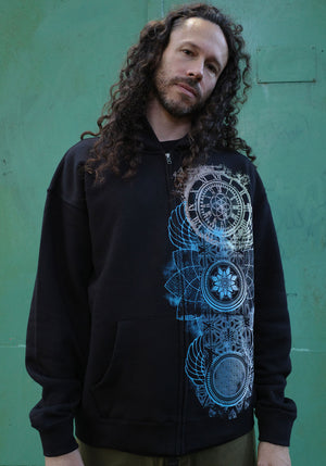On the front with two color fades, layers and textures, this is a remix of an older design that needed a fresh breath and to live on. The clock reads 5:28, which was my step brother’s birthday. When I created the original design I had been thinking about how much time had passed since we were kids. The complementary design wraps the clock with blessings, supporting the transition to other realms.