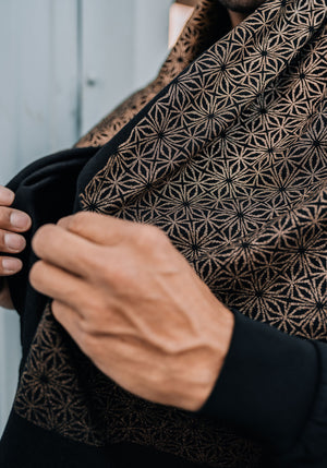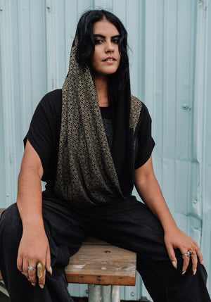 Prism Space is a repeated pattern that shifts depending on how you look at it. Printed in gold ink for an iridescent, eye-catching effect.