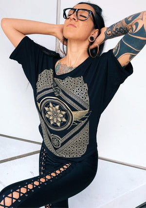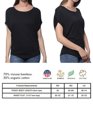 • Printed with gold metallic ink on a 70% bamboo and 30% organic cotton poncho shirt made in the USA