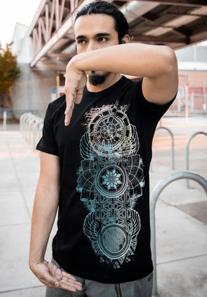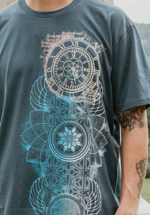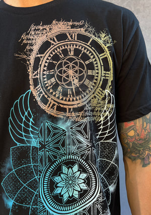With two color fades (rose gold to khaki and blue to white), layers and textures, this is a remix of an older design that needed a fresh breath and to live on. The clock reads 5:28, which was my step brother’s birthday. When I created the original design I had been thinking about how much time had passed since we were kids. The complementary design wraps the clock with blessings, supporting the transition to other realms.