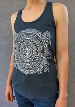* Printed on 60% cotton / 40% polyester blend navy racerback tanks