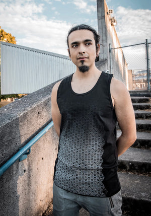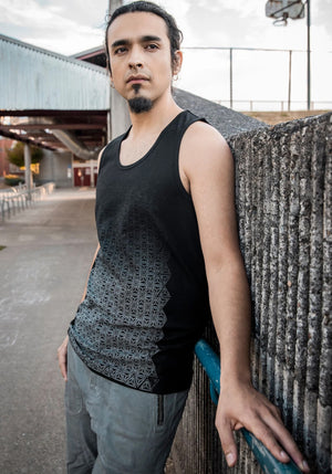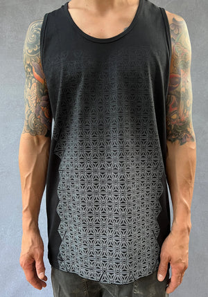 Fade 2 Black is a repeated pattern design inspired by the Merkaba symbol. This symbol has a variety of meanings and to me represents the union of spirit and body surrounded by light. This is the first geometric pattern print I have created that breaks the grid on the sides, adding a natural flow element to the art.