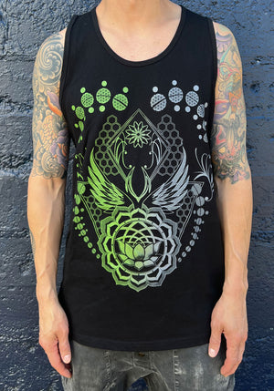 Lotus World was originally created for bandanas and was printed on a tank on a whim! We're more than happy with the results when adding the gray to green color fade. Sacred geometry, lotus, chakra and honeycomb inspired.
