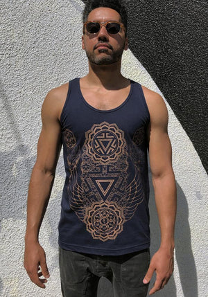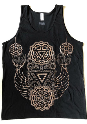 Our Ascendant Chakra design contains the Sanskrit mantra "Om Mani Padme Hum" (the jewel within the lotus) and the third chakra, the Manipura Chakra. Manipura, which means “lustrous gem," is a source of personal power and governs self-esteem, warrior energy and the power of transformation. It’s mixed here with repeated patterns and hard angle lines for depth, drawing inspiration from sacred geometry and flower of life.
