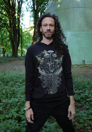 Created in collaboration with Chelsea Leigh, Mycelial Bloom represents the abundance of harvest season. After rain, sunshine draws out blooms of unique mushrooms connected to an intelligent network called mycelium, ranging unseen under the forest floor. We hope you take this piece as a reminder of the fruitful power of interconnectivity and community.