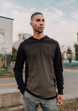 Prism Space is a repeated pattern that shifts depending how you look at it. Printed in gold ink for an iridescent, eye-catching effect.