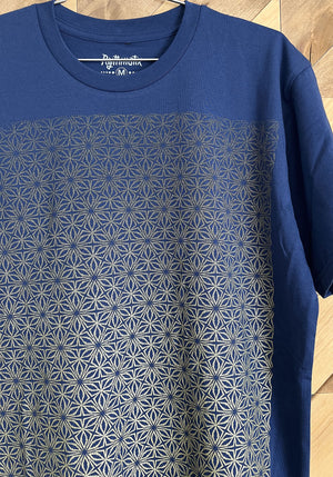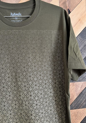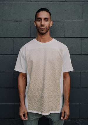 A repeated pattern that shifts depending how you look at it. Printed in gold ink for an iridescent, eye-catching effect.
