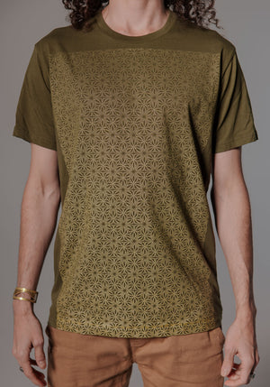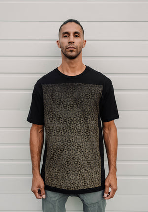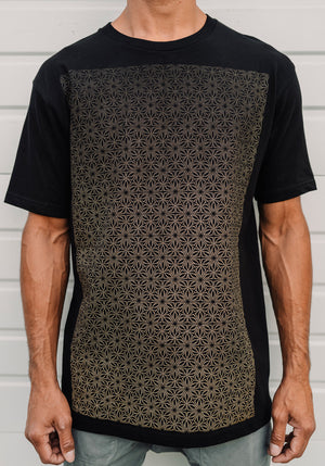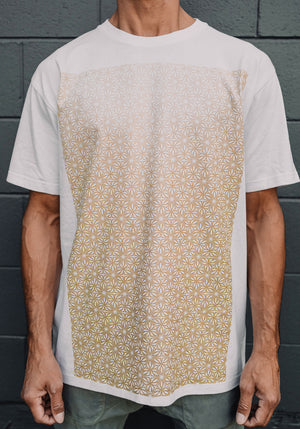 Our new repeated pattern reflecting prisms in space. Printed in gold ink with a subtle top to bottom fade.